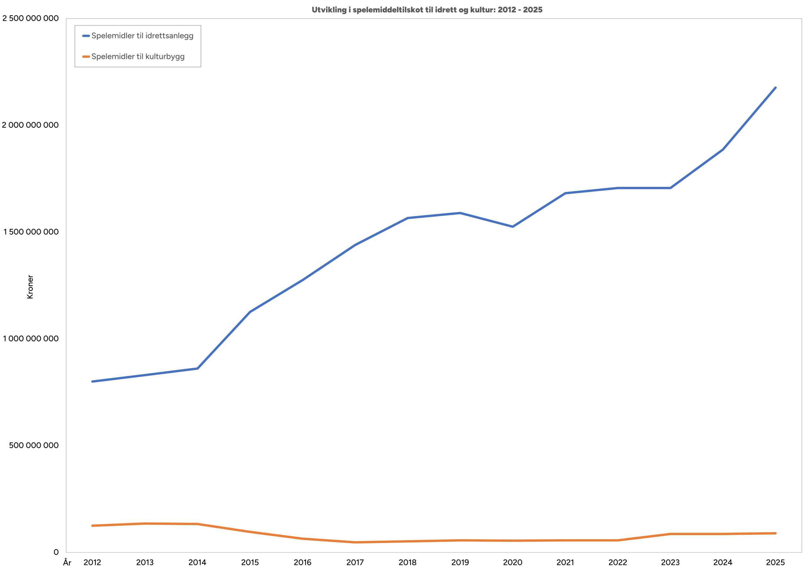 Her handlar det ikkje om å setje idretten opp mot kulturlivet, men om å synleggjere kor ulikt dei vert handsama politisk. I 2025 vart det løyvd om lag 2,5 milliardar kroner til idrettsanlegg gjennom spelemidlar og momskompensasjon (jf. https://tilskudd.lottstift.no), mens det til samanlikning vart løyvd 89,5 millionar kroner til kulturbygg.