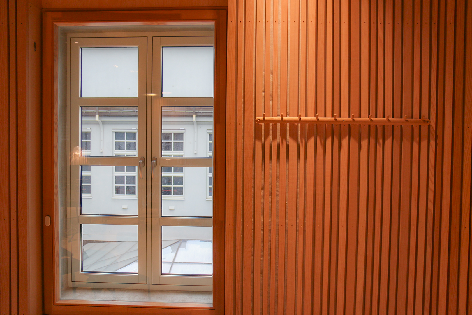 Det er forholdsvis moderne og romslig rom, med dempet parkett og lydisolering på veggene. Taket er eksponert betong, men det er ikke flatt. Klangen er dempet og perfekt for nettopp møter og foredrag.